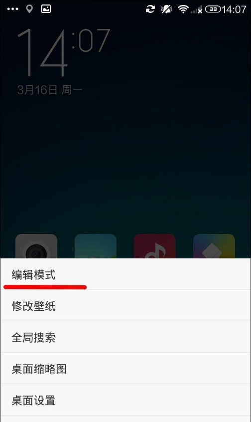 4、长按手机菜单键,直到弹出菜单栏,选择编辑模式。