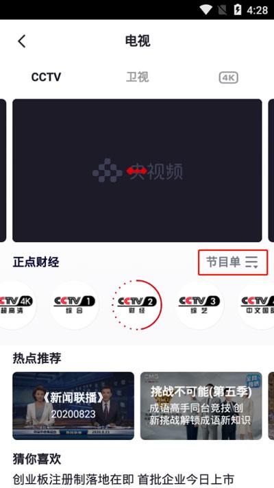 2、然后左右滑动CCTV频道,点击上方也可以切换到【卫视】,点击【节目单】查看当前频道的所有节目。