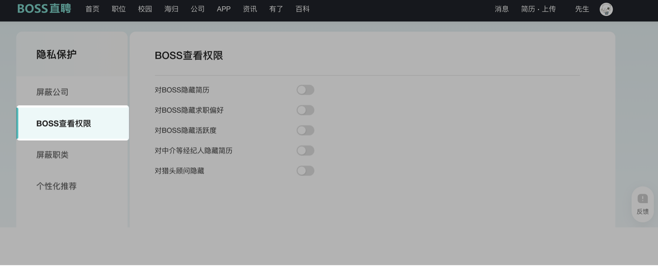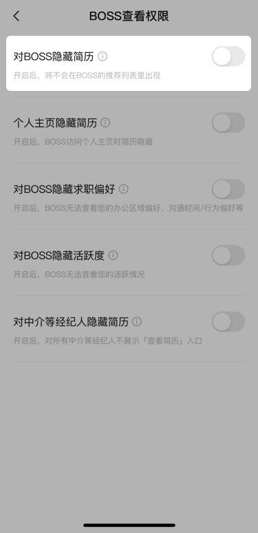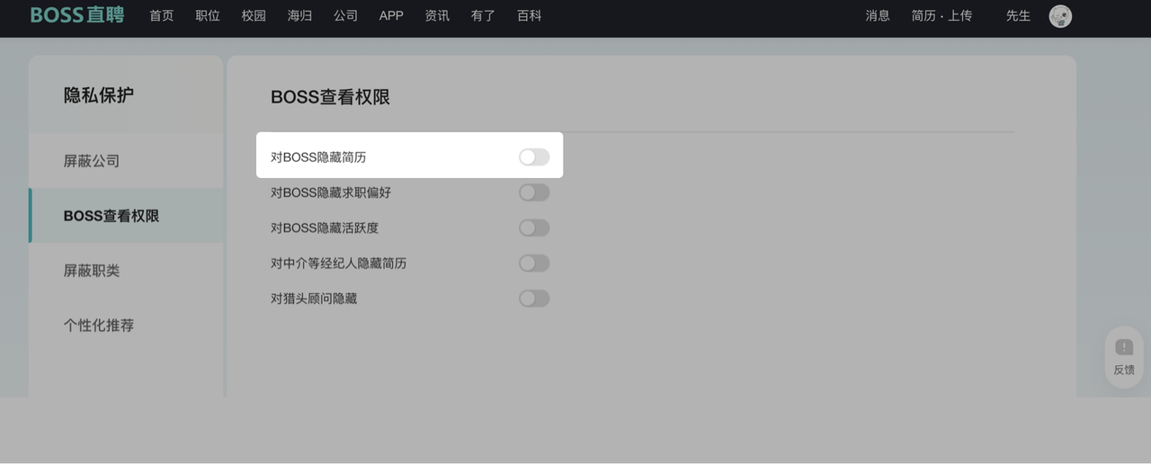 找到对BOSS隐藏简历,选择关闭或开启此功能。