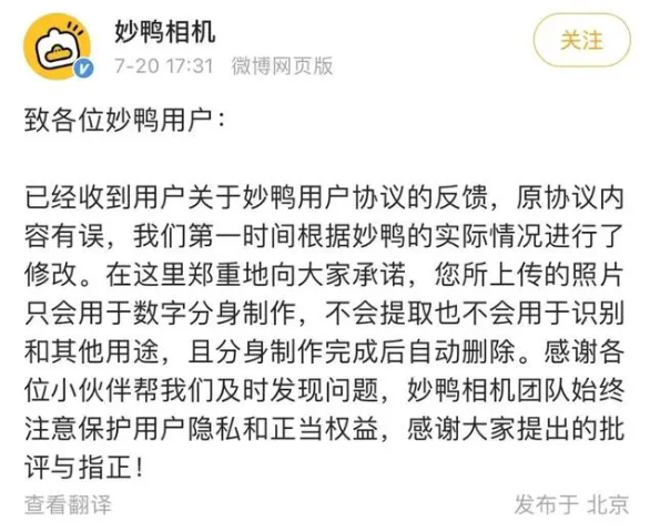 “妙鸭相机”事后的微博声明
