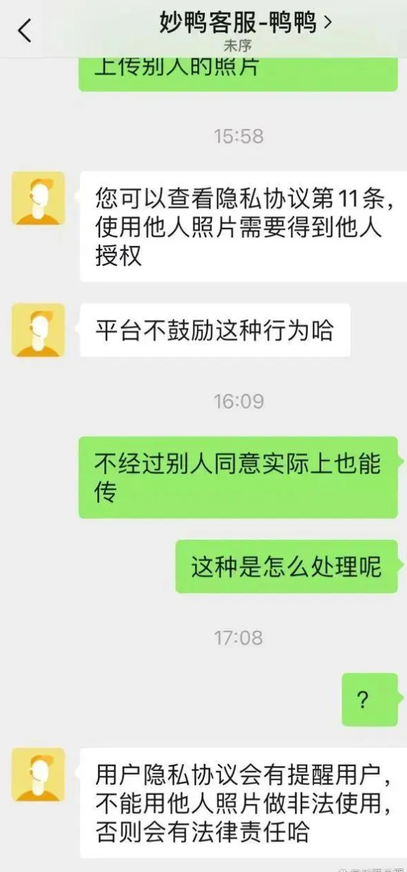随后,联系到妙鸭相机平台客服,对方回应“隐私协议第11条有规定,使用他人照片需得到他人授权”“平台不鼓励这种行为”,在追问其实际发生后如何处理这类情况,则得到了“需要承担相应法律责任”的回复。