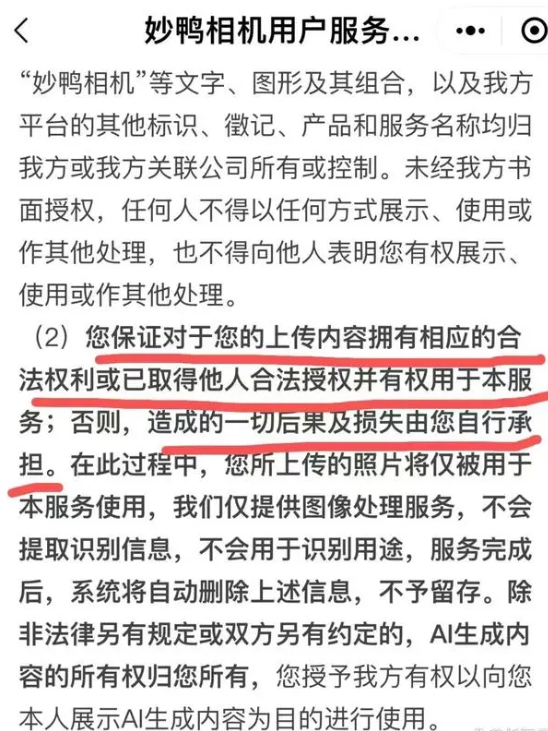 接着在妙鸭相机相关用户协议中看到文字显示,“您保证对于您的上传内容拥有相应的合法权利或已取得他人合法授权并有权用于本服务;否则,造成的一切后果及损失由您自行承担。”
