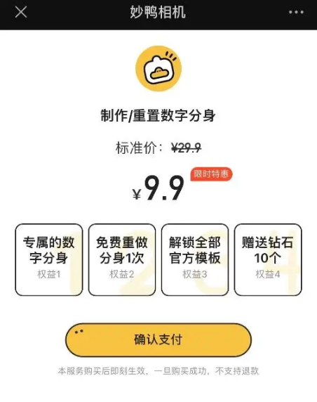 近期(7月26日),上海市消保委微信公众号称,近期看到了一些其他消费者的投诉,说在妙鸭相机程序储值了6元却没法用于合成费用,要求退款,对方始终保持我们绝不退款的态度。翻完该小程序的服务协议,并没有找到退款相关条款。唯一跟退款相关的只有在支付下方的这行:一旦购买成功,不支持退款。