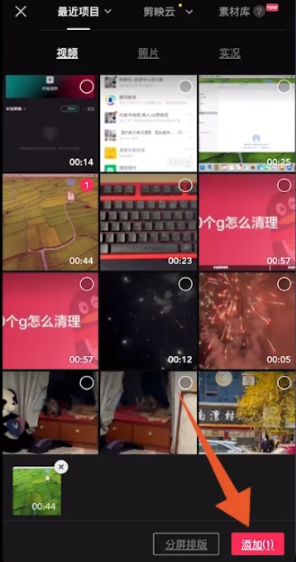 2、选择你想要剪辑的视频素材后,点击下方的【添加】。