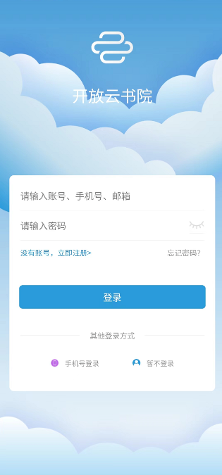 2、点击下方“我的”,进入登录界面,先登录下账号,如果之前已注册过开放云书院账号,就登录自己的账号,如果之前未注册过开放云书院账号,账号输入自己的手机号,密码为123456;