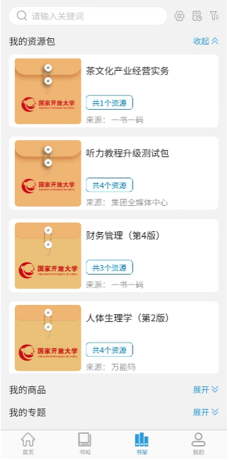 3、登录后,点击下方“书架”,我的资源包或者我的商品等,就可以查看到自己账号下的图书资源;