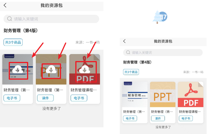 4、比如《财务管理(第4版)》,点击进入,可以看到相应的数字资源,点击下载,云朵样式就没有了,点击进入即可学习和阅读。
