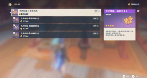 5、店里有4个【吉庆纸鸢】图纸,每个2万摩拉,分别是连年有余、诸事顺遂、翾翾蝶舞、亨通财运。