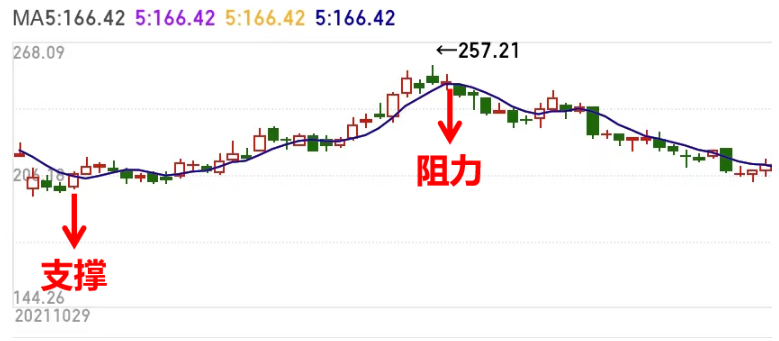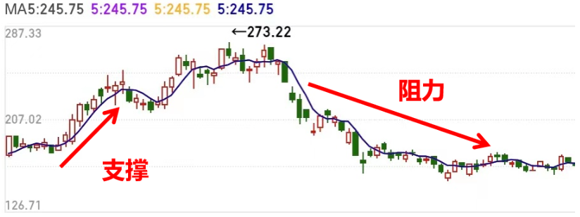 以5日均线为例,K线向上突破了5日均线,这条均线称为支撑线;同理,这条均线被跌破,则变成压力线。