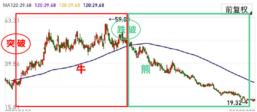 半年线也被称为“牛熊分界线”,越过MA120并站稳,则该股有望走牛;而跌破MA120则该股转熊。