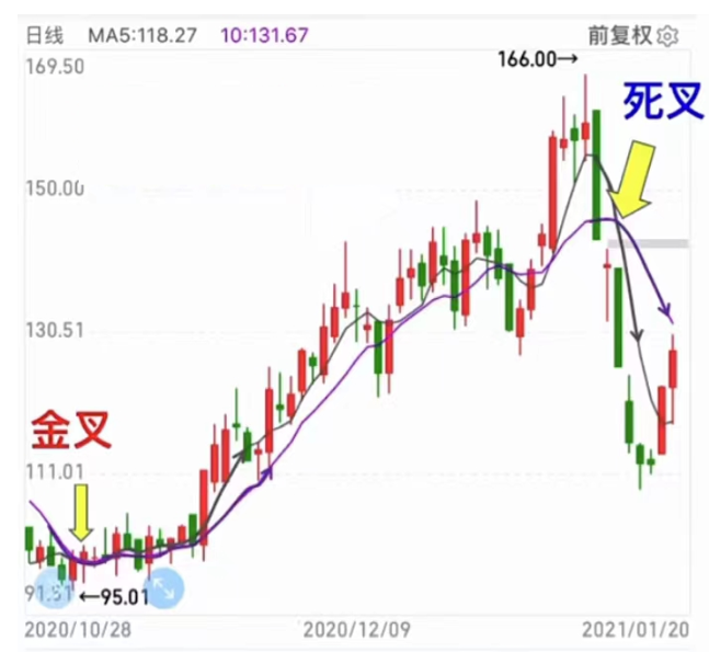 以5日和10日均线为例,下图中,两条均线一致向上,并且5日均线由下向上穿过10日均线,即为金叉;而两条均线一致向下,并且5日均线由上向下穿过10日均线,即为死叉。