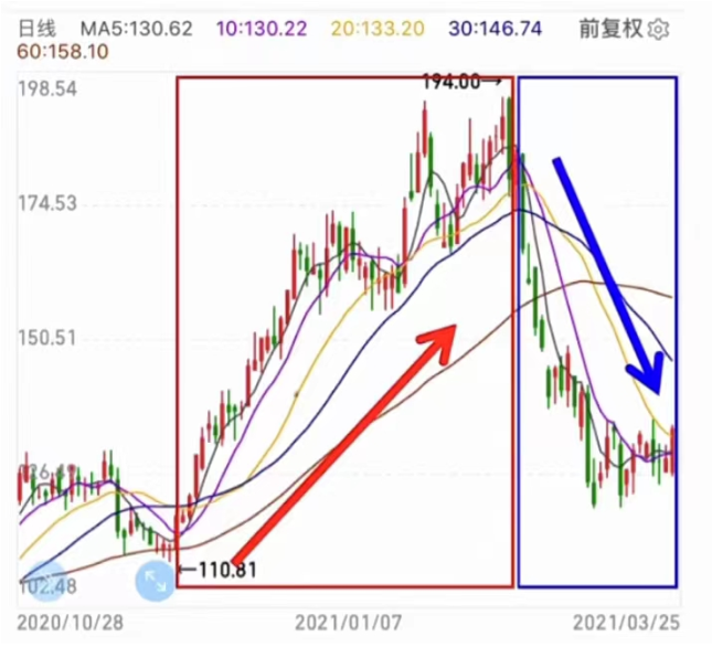 反之均线排列为60-30-20-10-5日,并且方向向下,称为空头排列,趋势为下跌趋势。