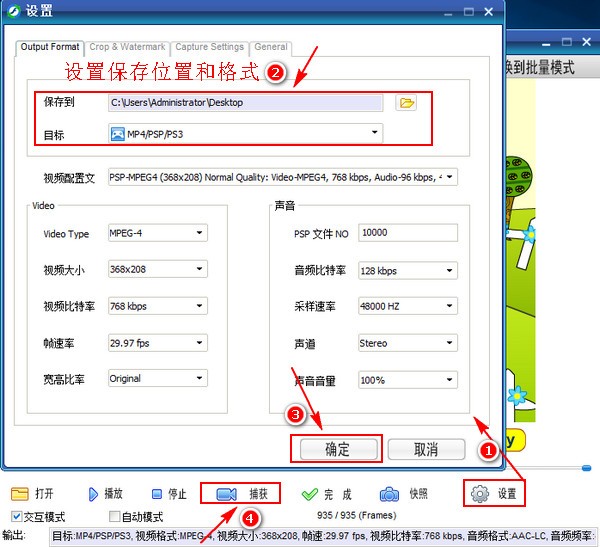 添加好要进行转换的视频文件之后点击界面中的“设置”工具,在设置对话框中设置好视频输出的位置以及视频输出的格式,这里选择MP4格式,设置好之后点击“确定”按钮,接着继续点击软件界面中的“捕获”按钮,开始对视频文件进行捕获。