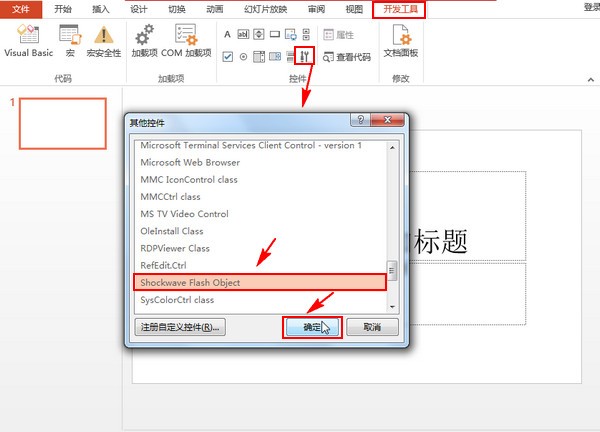接着打开自己电脑上面的office ppt,我这里使用的是2013版本,建议使用2010版本,在开发工具中点击像扳手一样的“其他控制图标”,接着在其他控件里面找到并选中“Shockwave Flash Object”,然后点击确定按钮。