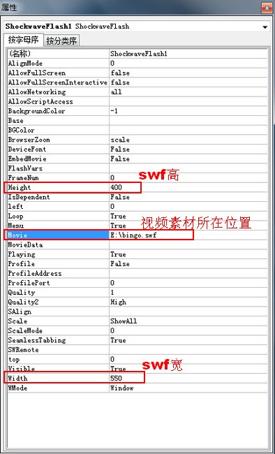 在属性的对话框中分别设置好swf视频文件的宽高分辨率,在Movie输入视频文件所在的详细地址,输入的时候要包含视频文件的名称。设置好了之后关闭当前对话框。