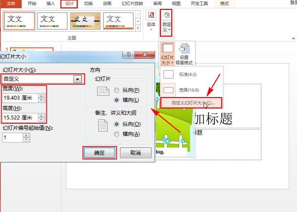 找到“设计”选项下面“自定义”下面的“自定义幻灯片大小”,然后在幻灯片大小对话框中输入新的宽高。