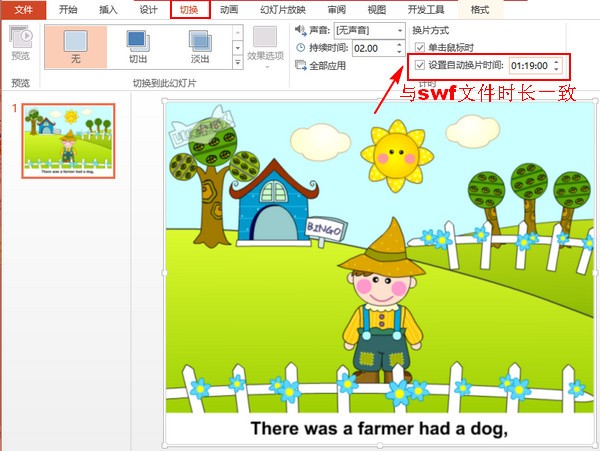 现在需要设置幻灯片的切换方式。在“切换”选项卡下面勾选“设置自动换片时间”,这个自动换片时间的参数应该要和swf视频文件的播放时间保持一致,所以又说自动换片时间就是swf视频文件的实际播放时间。