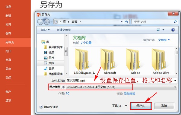 设置完之后就可以进行保存了,选择文件菜单下面的“另存为”,在另存为对话框中设置保存的名称、位置以及保存格式,但是这里要以ppt的格式进行保存。最后点击“保存”按钮即可。