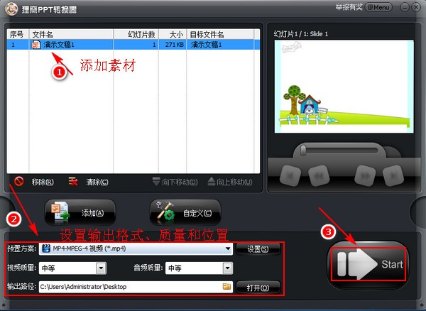 ppt文件制作好之后现在就要把ppt文件转换成视频文件了,用狸窝ppt转换器来进行转换。双击运行软件,点击界面上的“添加”按钮添加ppt文件,然后设置好输出格式、质量和位置,最后点击右下角开始转换输出就行了。