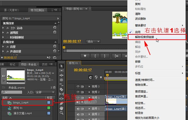 接着右击视频1轨道上的视频素材,在弹出的菜单中选择“解除视音频链接”,然后将音频1轨道上的音频文件删除,只需按键盘Delete键即可。