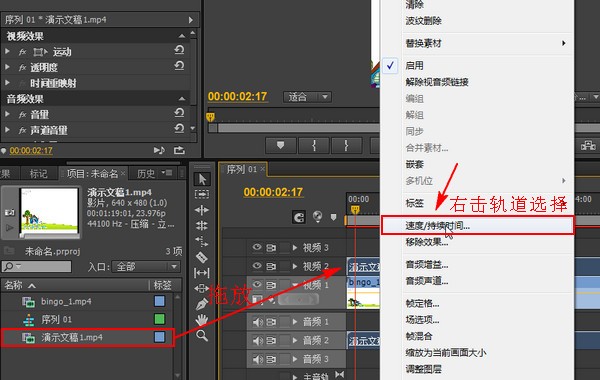 接着把有声音但没画面的素材拖放到视频2的轨道上,用同样的方法解除视音频链接,然后把视频2轨道上的视频文件删除,留下音频文件就行了。