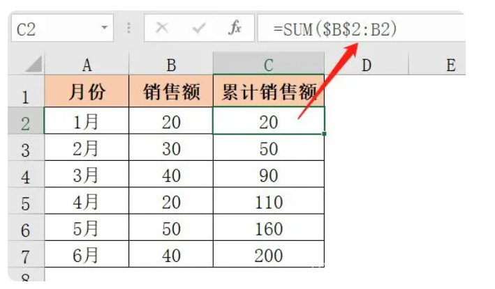 如下图所示,在C列计算截止到当月的累计销售额。