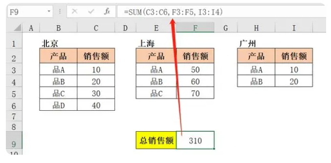 在F9单元格输入公式:=SUM(C3:C6,F3:F5,I3:I4)