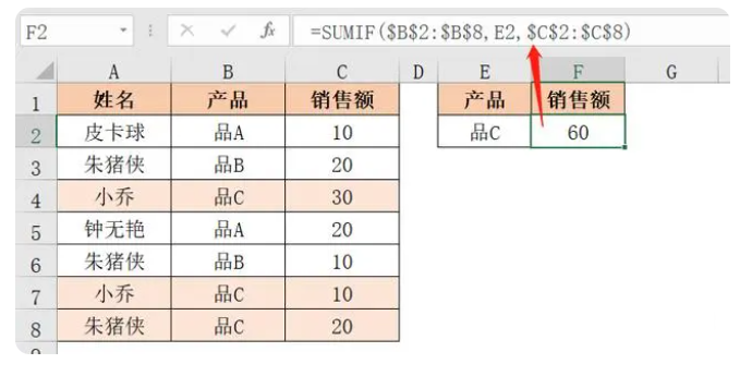 如下图所示,要求计算姓名为“朱猪侠”、产品为“品B”的销售额。