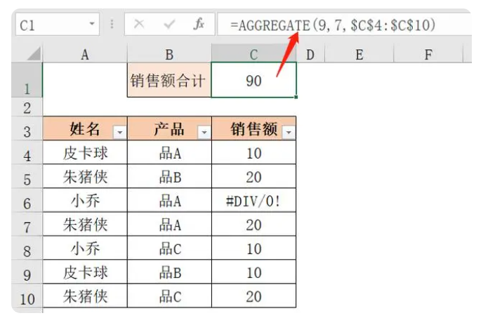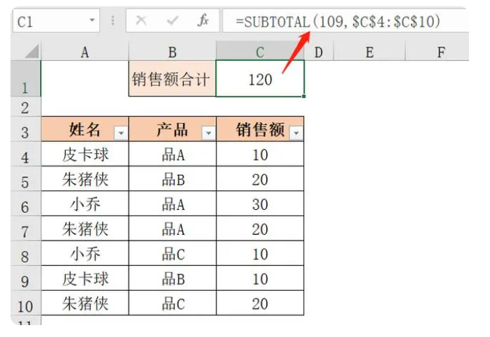 如下图所示,要求计算“朱猪侠”销售的所有产品,及“品C”的销售额之和。