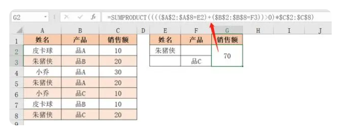 “(($A$2:$A$8=E2)+($B$2:$B$8=F3))>0”用于判断是否满足姓名为“朱猪侠”或产品为“品C”,当满足其中一个条件或同时满足时,公式返回TRUE。如果两个条件均不满足,公式返回FALSE。