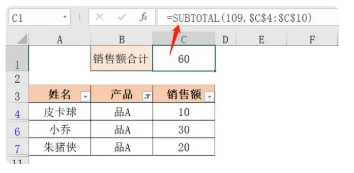 当筛选出产品“品A”的数据时,SUBTOTAL函数返回的结果为“60”。
