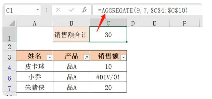 当筛选出“品A”的销售数据时,AGGREGATE函数返回的值为“30”。
