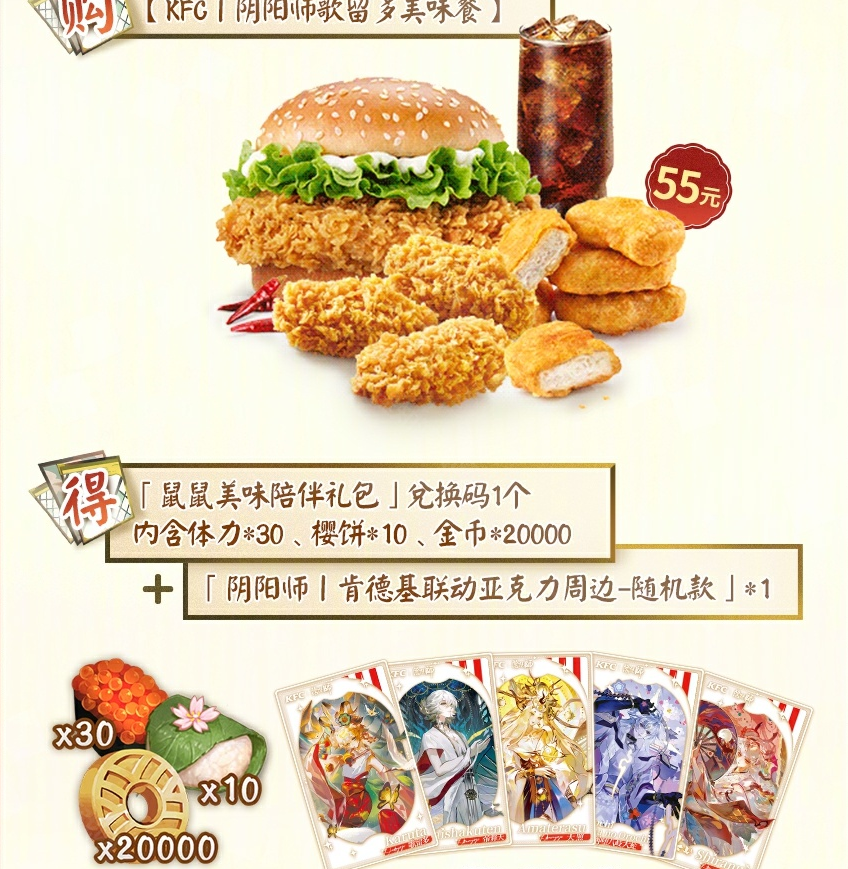 1、购买「KFC|阴阳师歌留多美味餐」,即可获得「KFC|阴阳师联动亚克力周边」*1个,「KFC|阴阳师鼠鼠美味陪伴礼包」兑换码1个