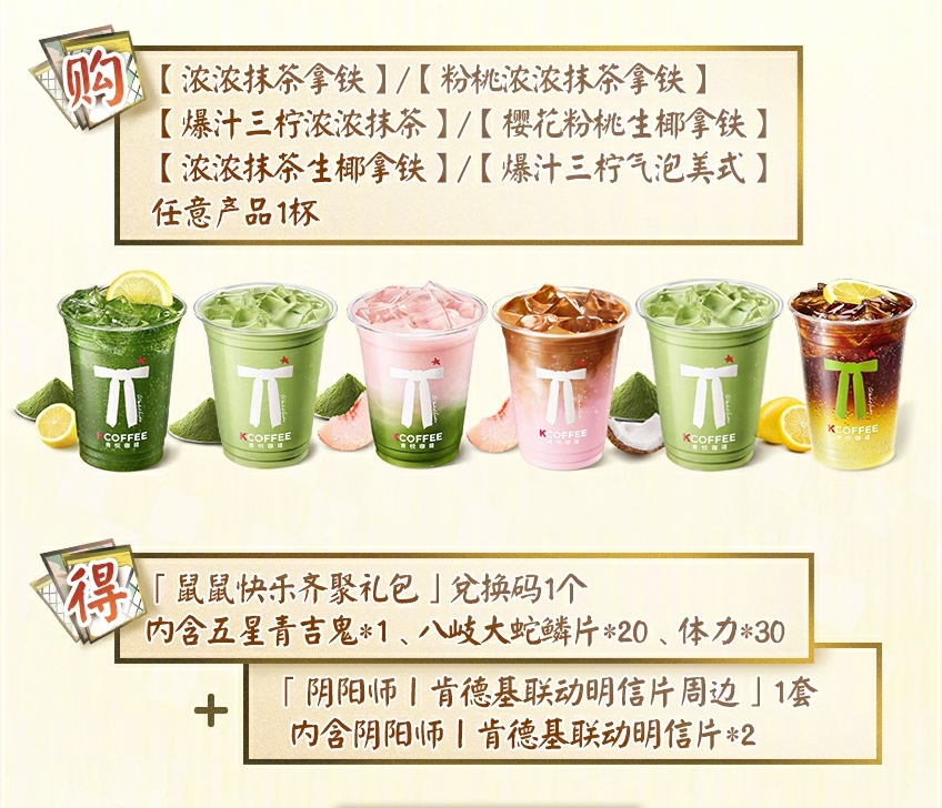 购买以下任意产品1杯即可获得「鼠鼠快乐齐聚礼包」兑换码1个,内含五星青吉鬼*1、八岐大蛇鳞片*20、体力*30以及「阴阳师|肯德基联动明信片周边」1套内含阴阳师|肯德基联动明信片*2