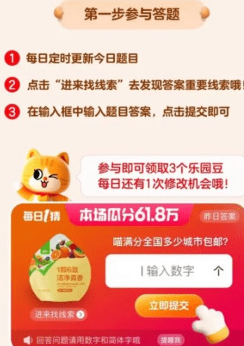 3、每天凌晨3点会公布当天的题目,在答题栏输入答案之后,点击提交即参加成功。