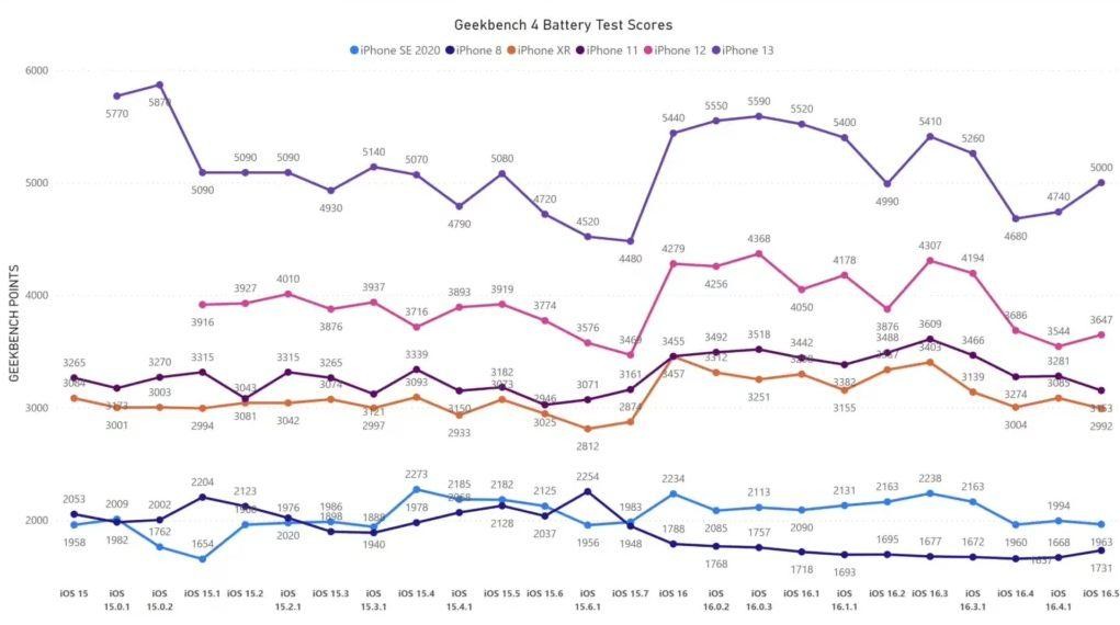 iOS 16.5 耗电情况实测近日以 6 款 iPhone 进行实测,分别是 iPhone 8、iPhone SE(2020)、iPhone XR、iPhone 11、iPhone 12 及 iPhone 13 进行 Geekbench 4 Battery 的跑分。