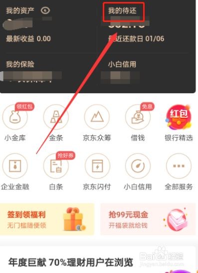 首先我们先下载京东经济,然后在打开京东经济APP并成功登录后,直接点击首界面右上角的【我的待还】。