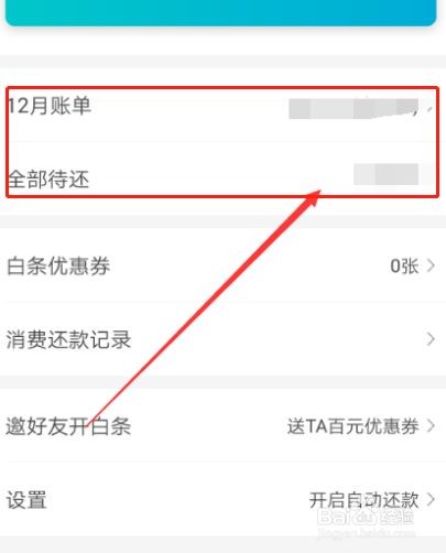 点击后直接进入京东信用界面,直接点击左上角的【白条】,进入京东白条界面后,直接点击下面的【全部待还】或者【12月账单】选项。