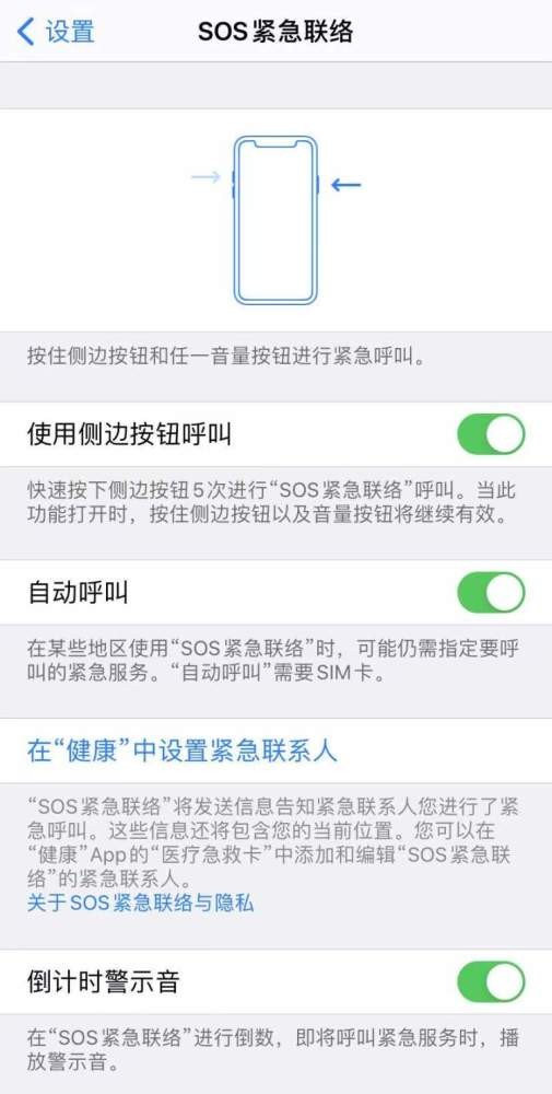苹果手机:长按锁屏键音量上键,界面有SOS。