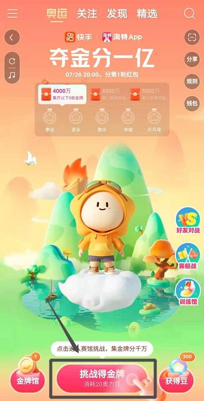 第一步、打开快手app,点击【奥运】,再点击下方的【夺金赛分一亿】