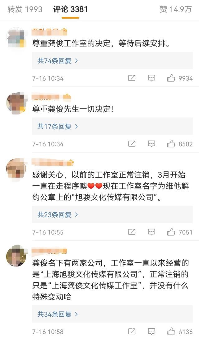 龚俊注销了原来的工作室,想必是要大展拳脚。粉丝称哪家公司还没个调整了,正常调整不必这么在意。 龚俊名下有两家公司,工作室一直以来经营的是“上海旭骏文化传媒有限公司”,正常注销的只是“上海龚俊文化传媒工作室”,并没有什么特殊变动。