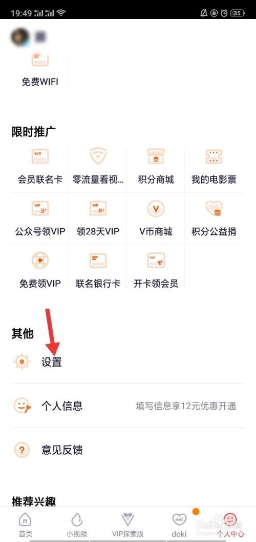 2、进入到“个人中心”操作页面后,我们向下滑动页面,找到“其他”选项卡,此选项卡下面分为3个小的选项,我们点击“设置”选项卡,点击后进入到设置选项的操作界面,进行下一步操作。