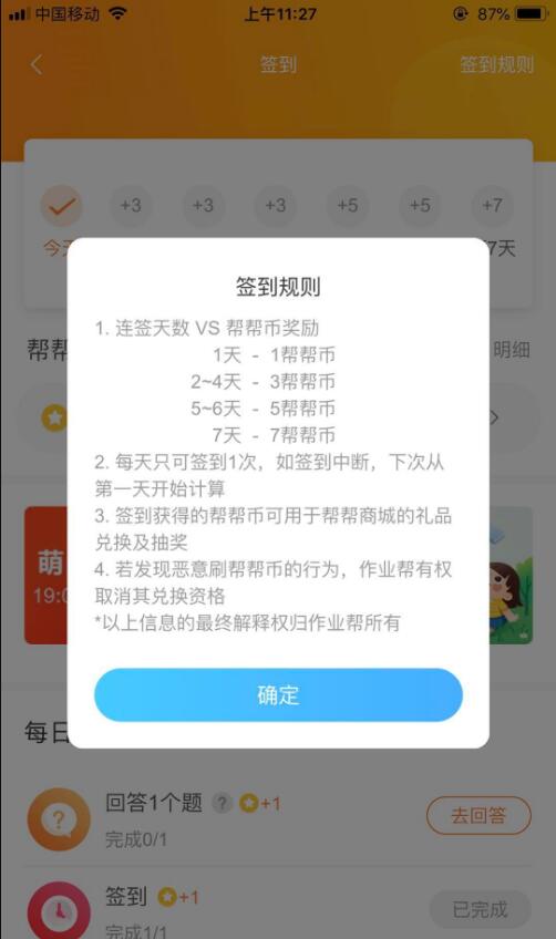 1、在作业帮APP中通过每日签到打卡、完成每日任务和推荐任务都可以获得帮帮币。