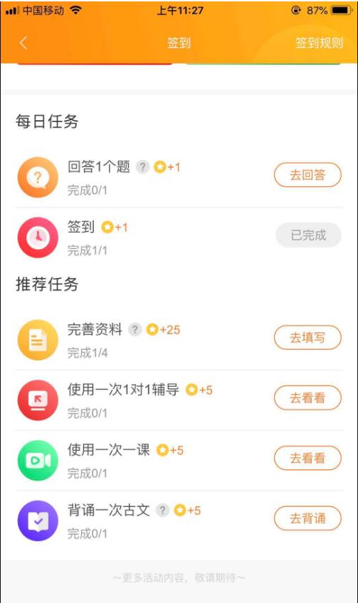 系统还激励用户使用app里面的其他功能,例如完善资料,进行1对1辅导,用一次一课,以及背诵一次古文都能获得对应的帮帮币奖励,但是这些都是一次性的奖励,不能每天获取。