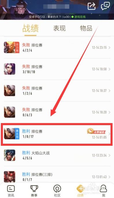 6、进入王者营地应用后,我们点击界面下方“战绩”图标,进入战绩界面。在战绩界面中我们找到一条排位的对战信息。