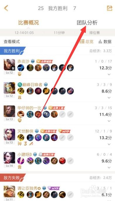 7、进入对战信息界面后,点击对战信息详情界面右上角“团队分析”进入分析界面。