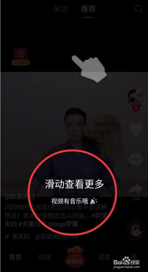 2、接着在“滑动查看更多视频有音乐哦”上面按住,向上滑动一下。