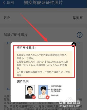 5.跳转驾驶证照片提交界面,会弹出照片的尺寸要求,要按要求上传。
