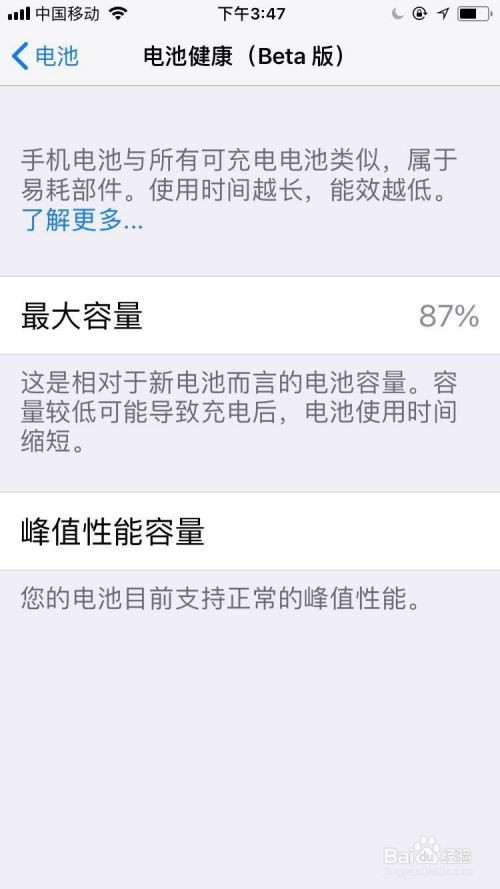 3、电池健康度也就是随着iPhone的使用时长,电池的最大容量会慢慢衰减,电池容量低于80%的话,iPhone的处理器就会降频,直接带来的影响就是会变卡顿;如果日常使用中,只是刷朋友圈或者看看微博对于性能要求不高的需求,那么较低的电池容量还是能够使用的;不过如果您在日常使用中经常是用来玩游戏,建议在降低到80%左右就更换电池。