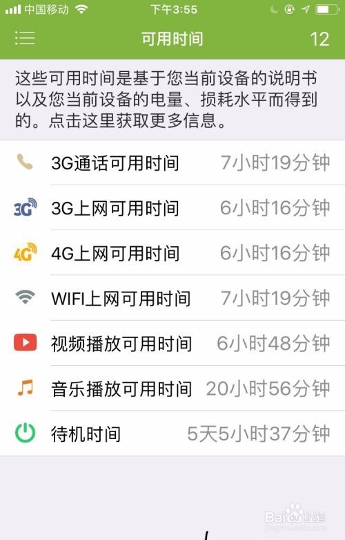 4、点击“可用时间”,可以查看3G通话、上网,4G通话、上网,wifi上网可用时间,视频播放可用时间,待机时间等等